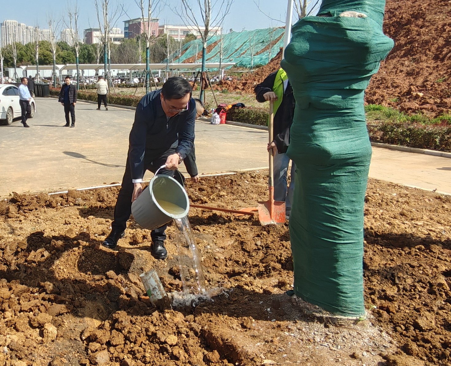 上午10点30分,植树活动正式开始。校长傅欣和副校长冯军带领志愿者们分工协作、默契配合,挖坑、扶苗、填土、浇水,每一个环节都认真细致、有条不紊。活动现场,校领导与师生代表并肩协作,挥锹铲土、扶苗填坑、围堰浇水,每一道工序都严谨细致。