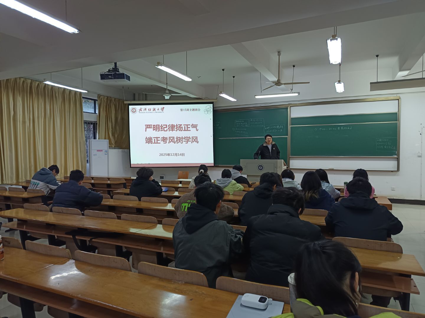 为强化学生纪律意识,筑牢诚信考试防线,营造优良学风氛围,12月14日,学院组织本科生各年级及研究生于崇礼楼集中开展“严明纪律扬正气 端正考风树学风”主题教育班会。班会紧扣考试季节点,从思想引领、纪律警示、备考指导、风险防范等多维度展开,为学生送上全方位的考前“必修课”。